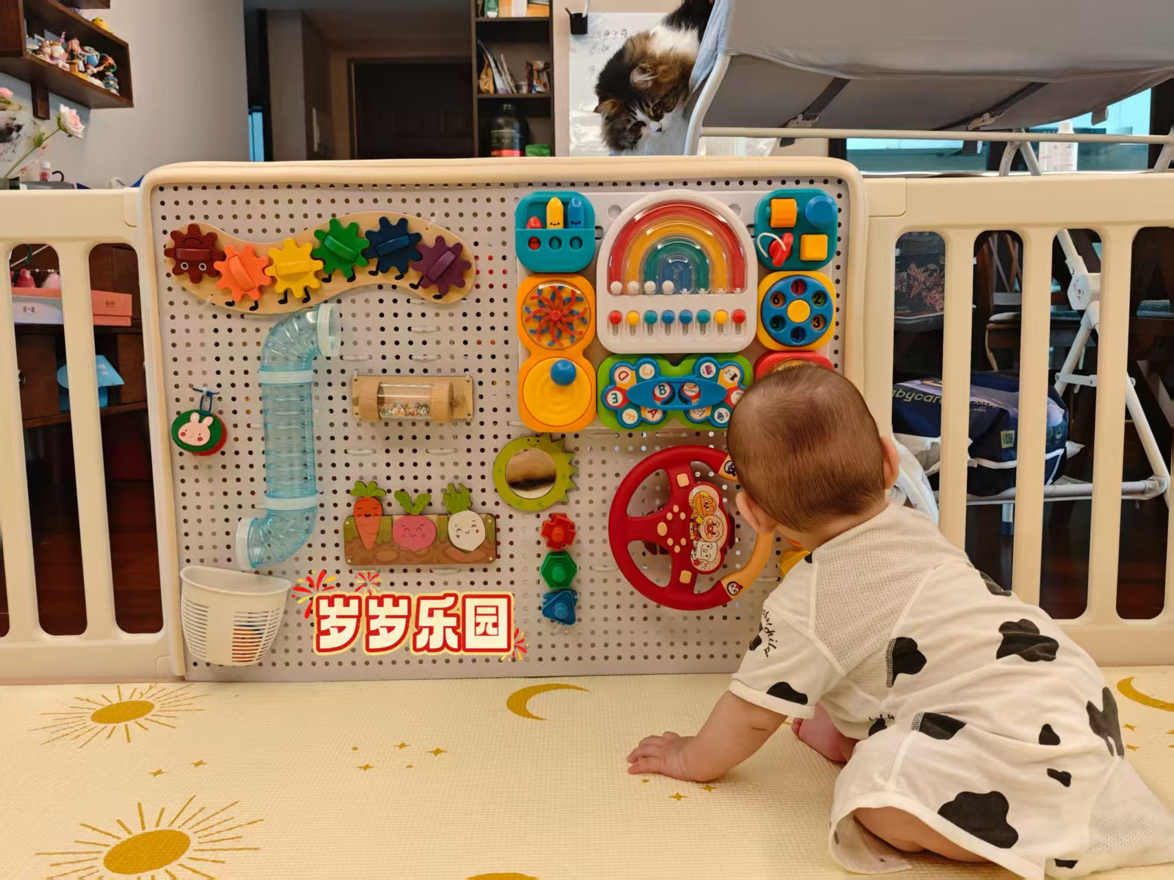 “安全”成了家里的最高信条。爬爬垫旁围上了高高的护栏,床头贴满了厚厚的防撞条,所有玩具每天清晨都会接受酒精的洗礼,地板被拖得锃光瓦亮。有一次岁岁扶着围栏不小心磕到头,哭得梨花带雨,我出于实践的精神,也用同样的力度自己撞了一下……嗯,确实挺疼的。客厅几乎被改造成了他的专属游乐场,国庆假期,我和岁岁妈还跟风给他做了个“忙碌板”,挂在围栏上,看着他专注地拨弄着上面的小机关,我们相视一笑,感觉又能换来半小时的“和平时光”。