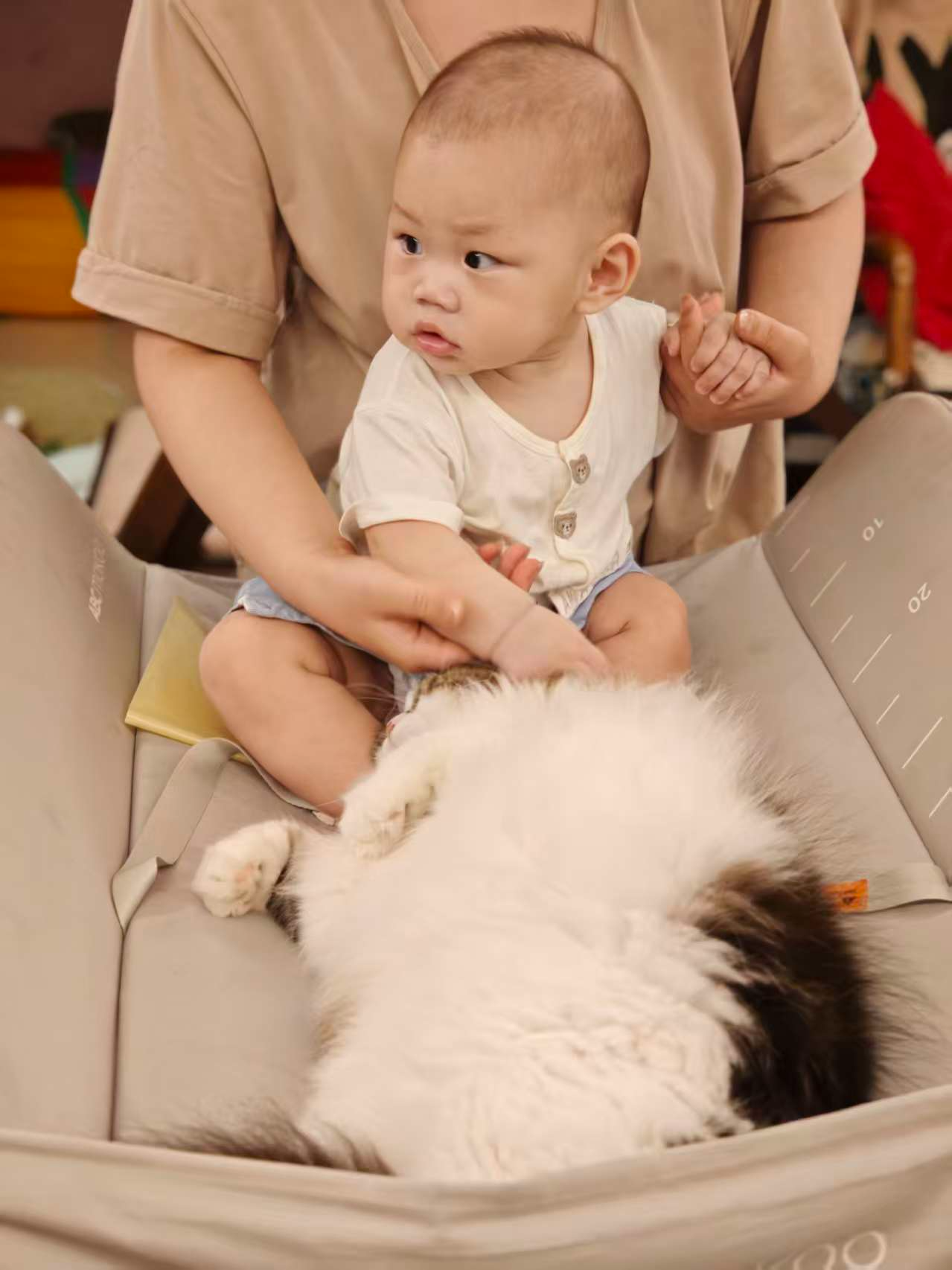 现在,岁岁一看到可乐,就会兴奋地大叫,挥舞着双手像在召唤。而可乐呢,也早已没了当初的警惕,它会打着满足的呼噜走过来,用头使劲在岁岁的小手上、腿上蹭来蹭去,然后“碰瓷”似的,软绵绵地倒在岁岁身边。岁岁会好奇地伸出“魔爪”,试图抓住那条毛茸茸的尾巴。他还不懂得轻轻抚摸,只是激动地胡乱拍打。可乐被抓到时,总是表现出超凡的耐心,最多只是无奈地长叹一口气。我严重怀疑,在它的猫科世界观里,可能把这个只会爬的“两脚兽幼崽”,当成了某种发育迟缓的同类。